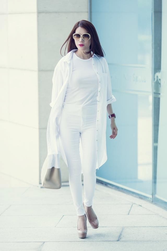 Hay cả cây trắng thanh lịch, tinh tế, giúp mang đến cảm giác nhẹ nhảng, thoải mái cho mỹ nhân gốc Hà Nội. Đồng thời cách phối túi và giày cùng tông màu nude cũng được cho là giúp tăng chiều cao đáng kể.