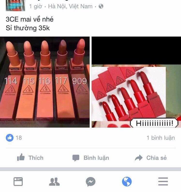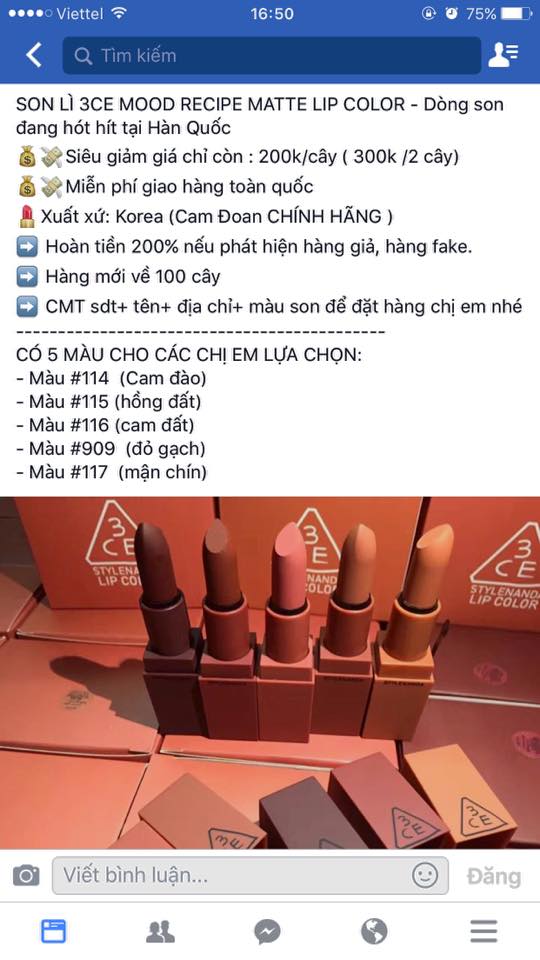 Tìm kiếm theo hashtag hay đơn giản chỉ là dạo một vòng các shop bán mỹ phẩm online trên Facebook và Instagram, ta sẽ dễ dàng thấy rất nhiều thông tin về son lì 3CE Mood Recipe với đủ mức giá cũng như lời “mời chào” khác nhau. Nhưng tất nhiên, với một thỏi son vẫn đang hot rần rần như Mood Recipe thì giá bán không thể giảm tới mức thấp như những lời quảng cáo.