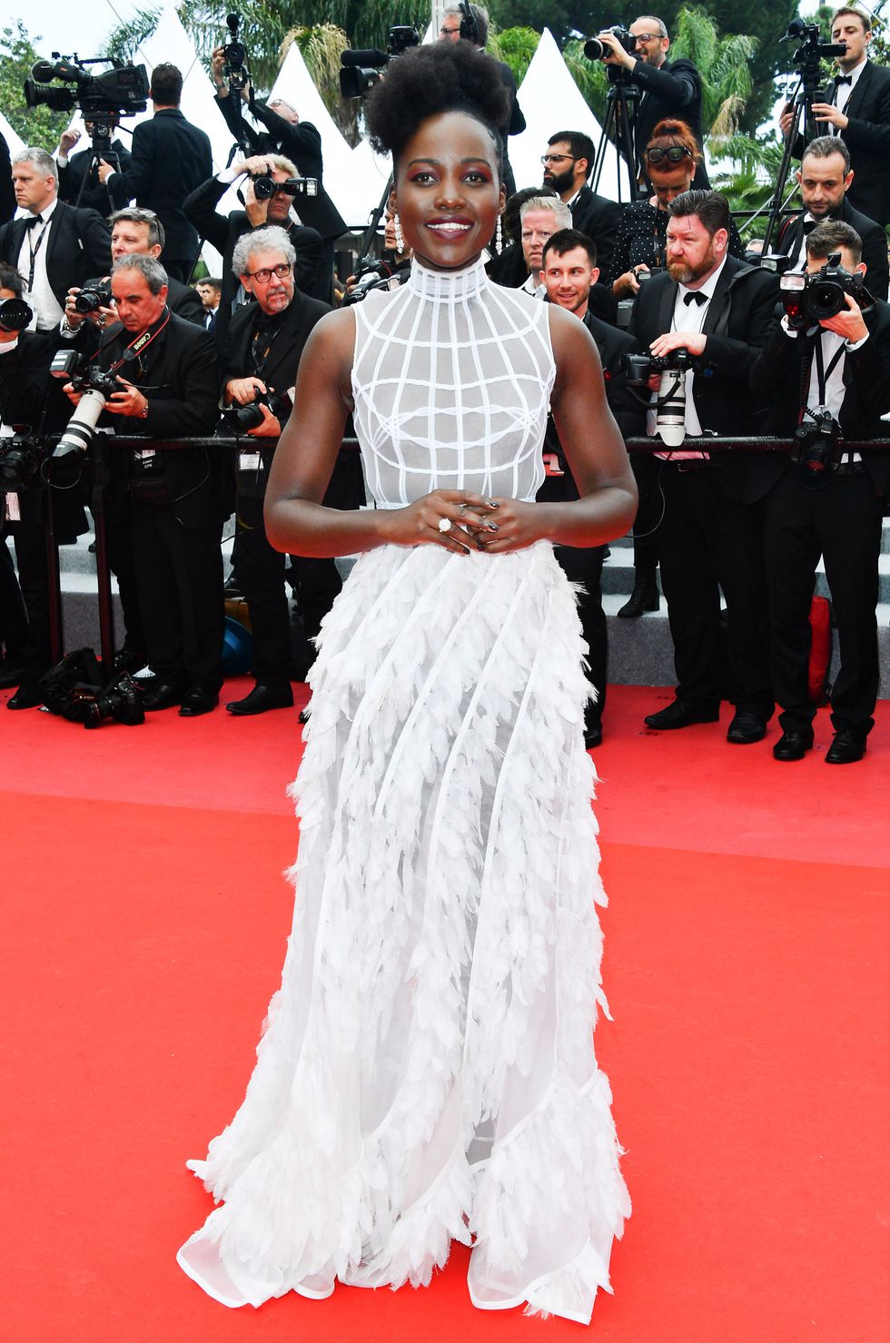 Diễn viên điện ảnh Lupita Nyong’o khoe làn da màu khỏe mạnh trong chiếc đầm trắng tinh khiết.