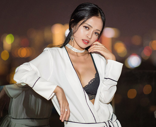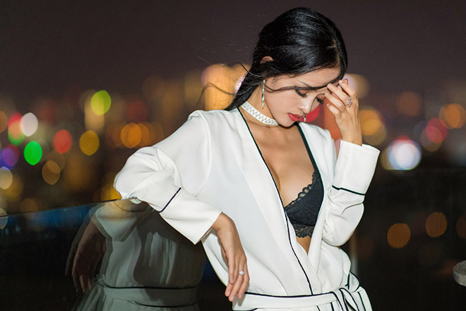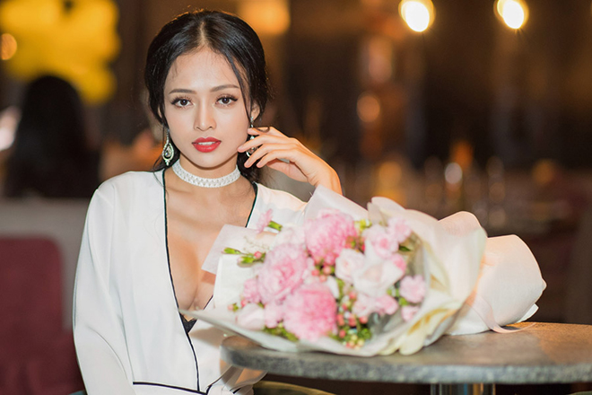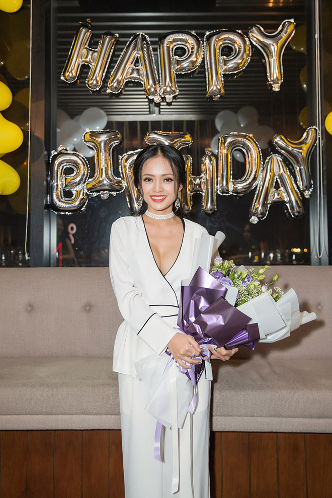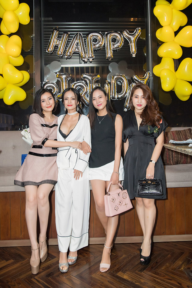 Trong tiệc sinh nhật, Thanh Trúc chơi trội khi diện trang phục khá gợi cảm. Cô mặc bộ đồ lụa màu trắng theo phong cách pijama. Người đẹp gây ấn tượng với cách chơi màu trắng đen cá tính và táo bạo, Thanh Trúc diện áo bralette bên trong áo cánh. Cô khéo khoe vòng 1 nở nang căng đầy trước ống kính.