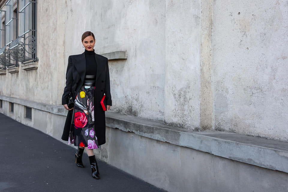 Trang phục thương hiệu Prada. Do thời tiết lạnh giá nên hầu hết những outfit đều kín bưng.