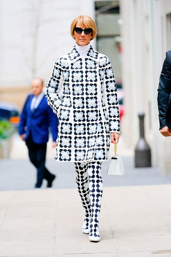 Môt set đồ “ton sur ton” hoa hòe của Moncler Richard Quinn từ trên xuống chân của Celine Dion với mái tóc được buộc gọn gàng