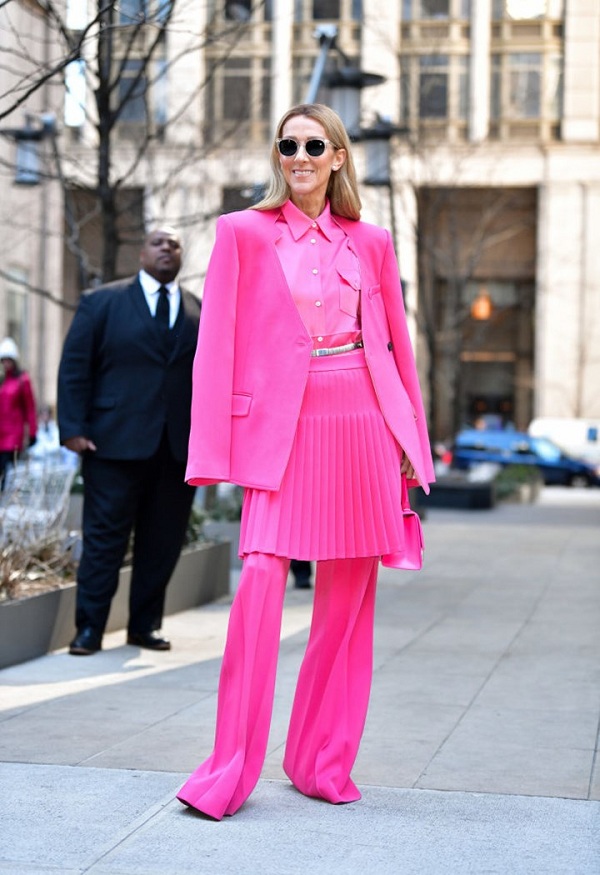 Sắc hồng tiếp tục được Celine Dion sử dụng triệt để khi bà chọn bộ cánh màu hồng neon của NTK Peter Do mix cùng kiểu túi Balenciaga xuyệt tông