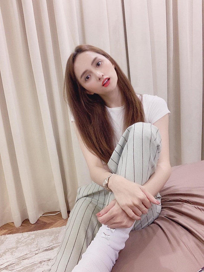 Hoa hậu Hương Giang dù đang trong bệnh viện với chân bó bột nhưng không vì thế người đẹp lại trông luộm thuộm hay xuống sắc, ngược lại HLV Giọng hát Việt nhí rất xinh xắn và trẻ trung trong set đồ áo croptop trắng khoe vòng eo “con kiến” mix cùng quần ống rộng sọc caro.