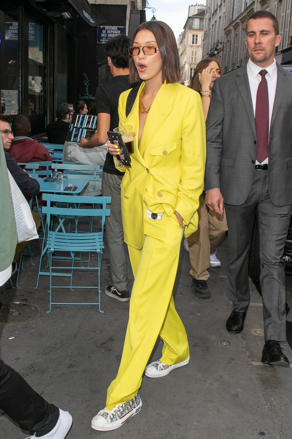 Bộ suit vàng nổi bật kết hợp với giày sneaker trắng khi cô đang tại Paris vào cuối tháng 6 vừa qua