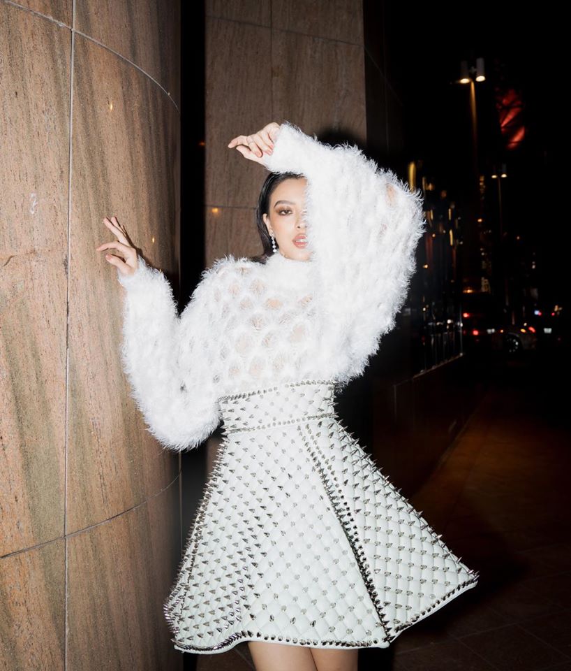 Mới đây, người đẹp tiếp tục khiến các fan mãn nhãn khi thả dáng trong set đồ đơn sắc theo tông màu trắng cá tính. Diện áo lông và váy xòe nạm đính gai, người đẹp khoe được đôi chân dài nuột nà tít tắp cùng ánh mắt sắc lẹm.