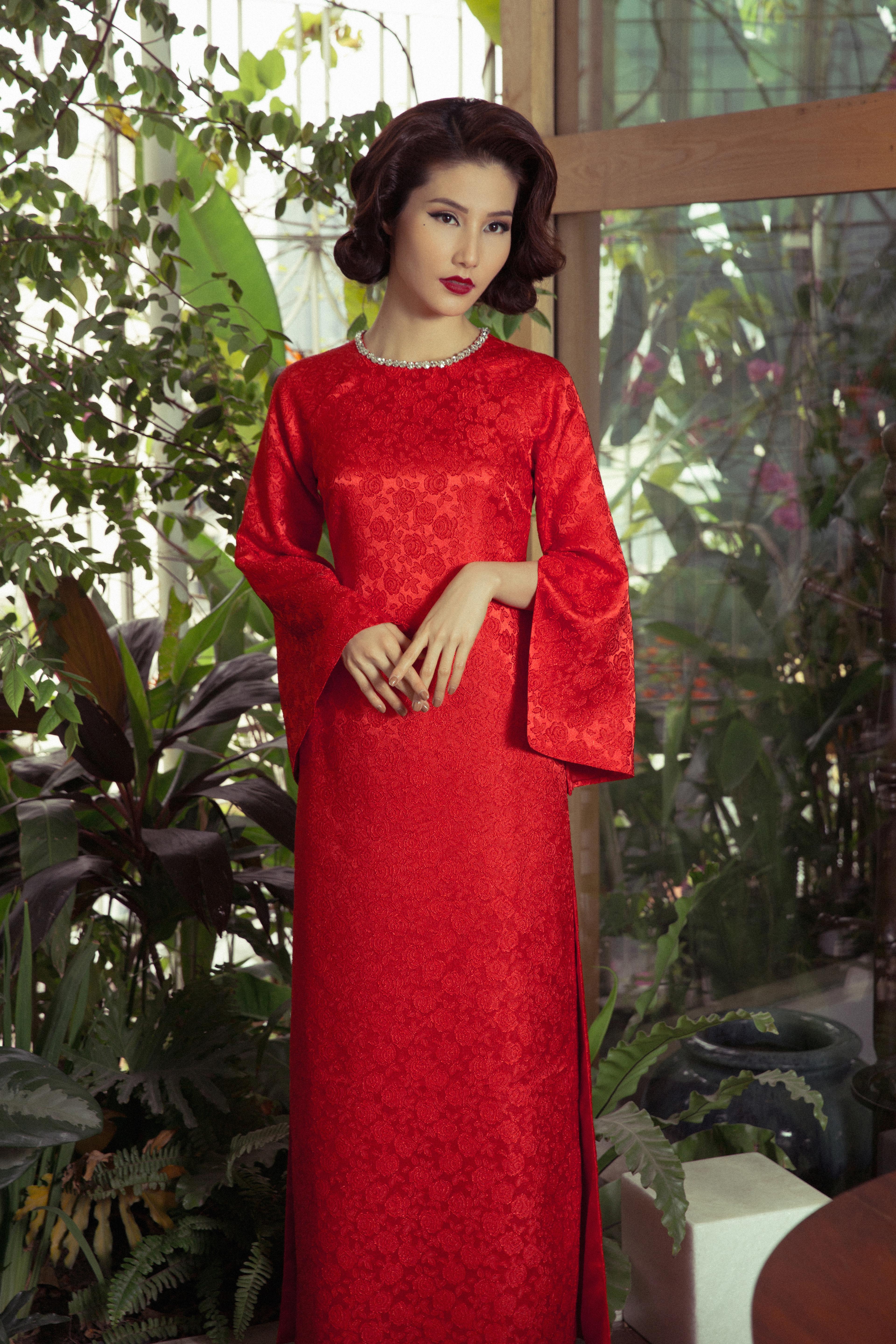 Bên cạnh các mẫu thiết kế in ấn, BST còn có những tà áo dài với chất liệu ren dệt màu sắc.