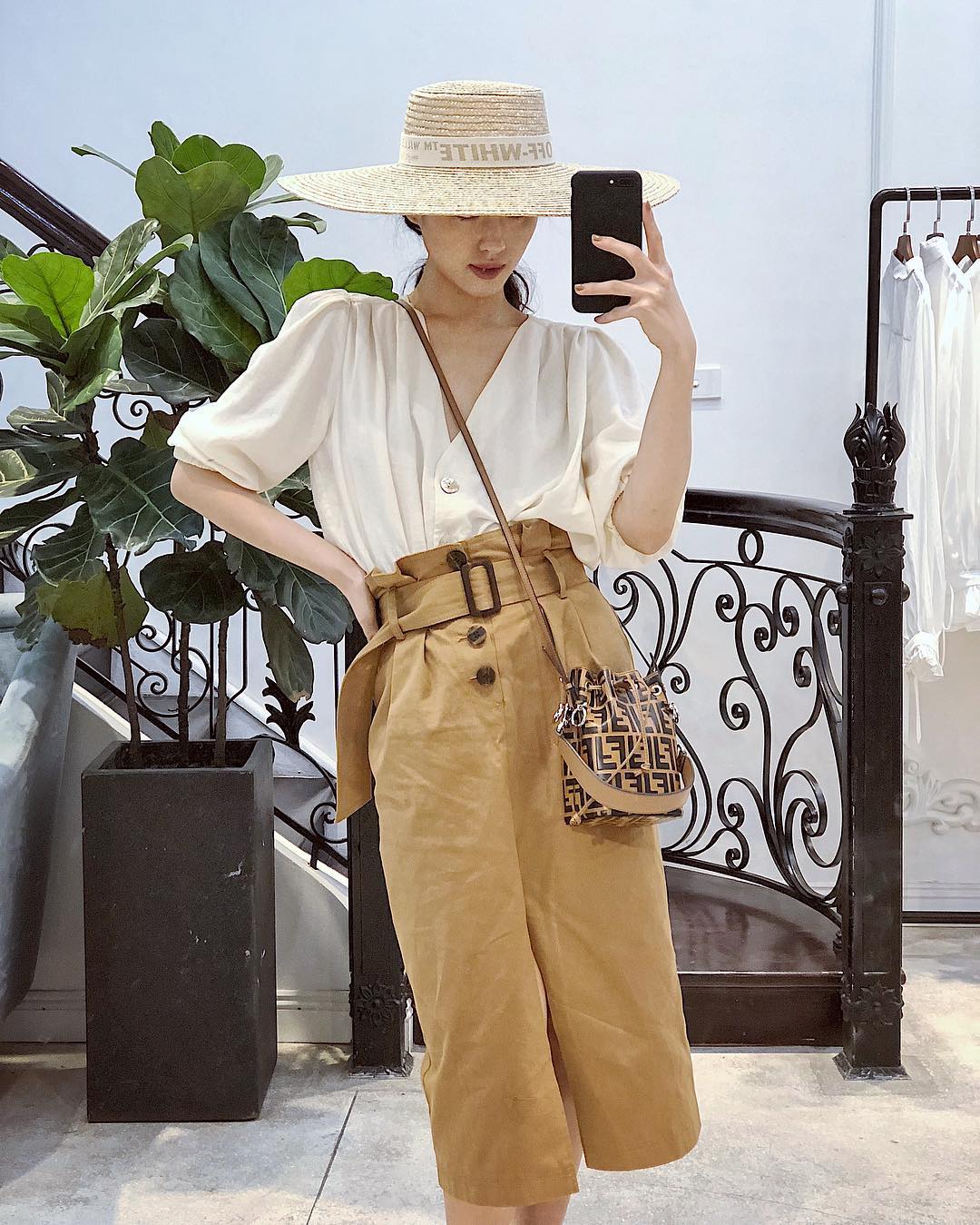Khánh Linh The Face đem đến không khí mùa hè với chiếc mũ cói rộng vành che nửa mặt. Cô nàng cũng phối với áo sơ mi trắng và chân váy màu beige để hoàn thiện tổng thể.
