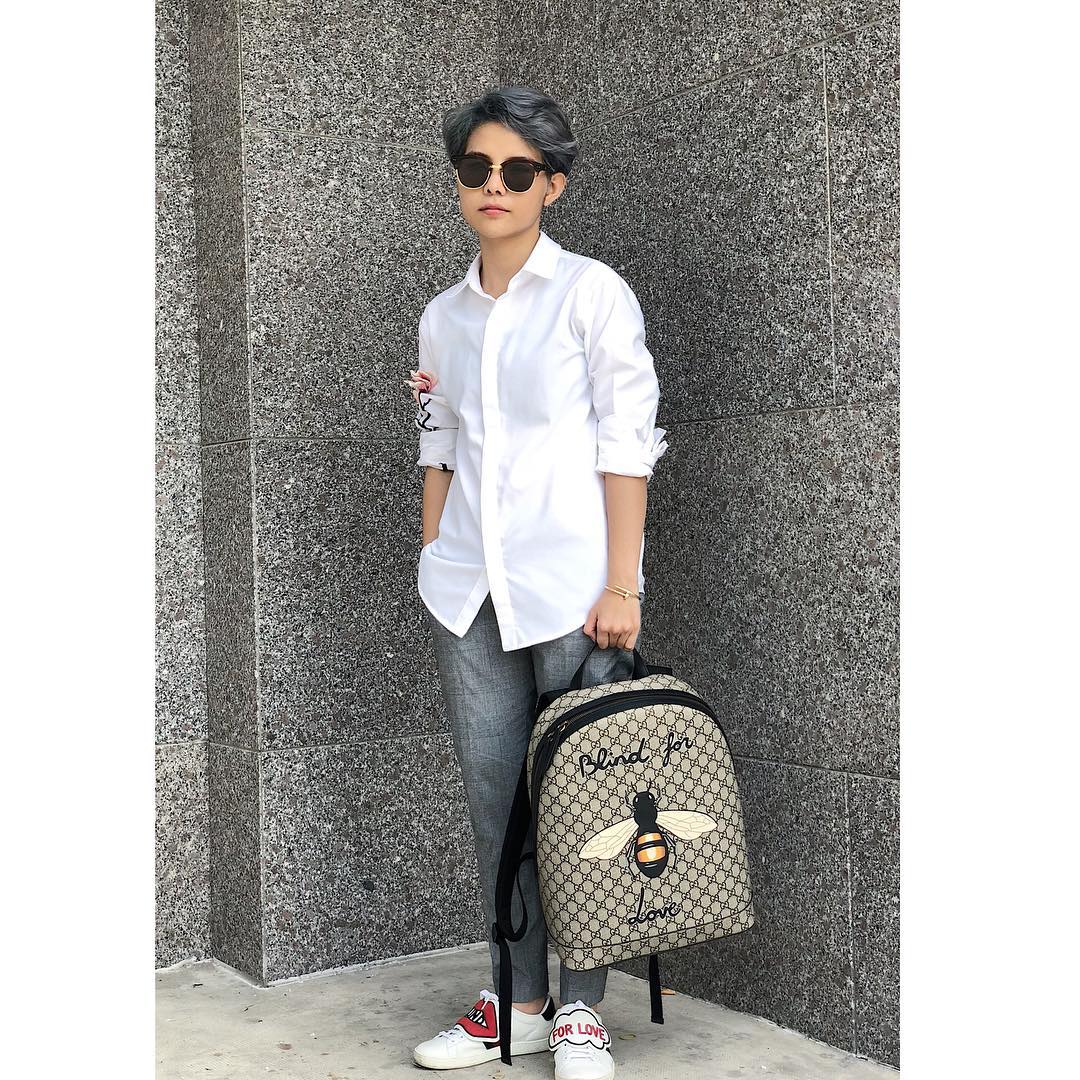 Không lựa chọn đầm váy như nhiều sao nữ khác, Vũ Cát Tường cá tính khi mặc outfit gồm sơ mi trắng và quần jeans xé gấu. Bên cạnh đó, các tín đồ thời trang không thể không chú ý đến chiếc ba lô với biểu tượng con ong đặc trưng của Gucci mà cô nàng đang sử dụng.