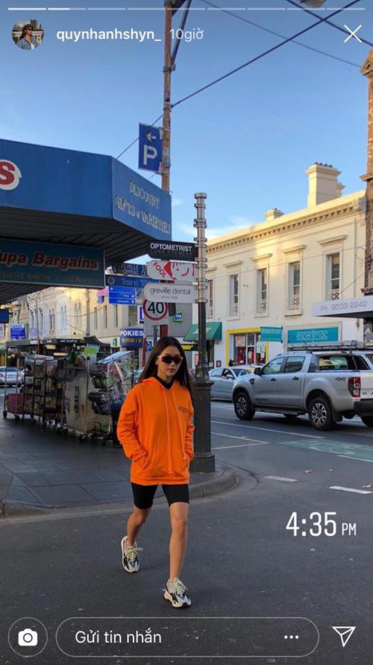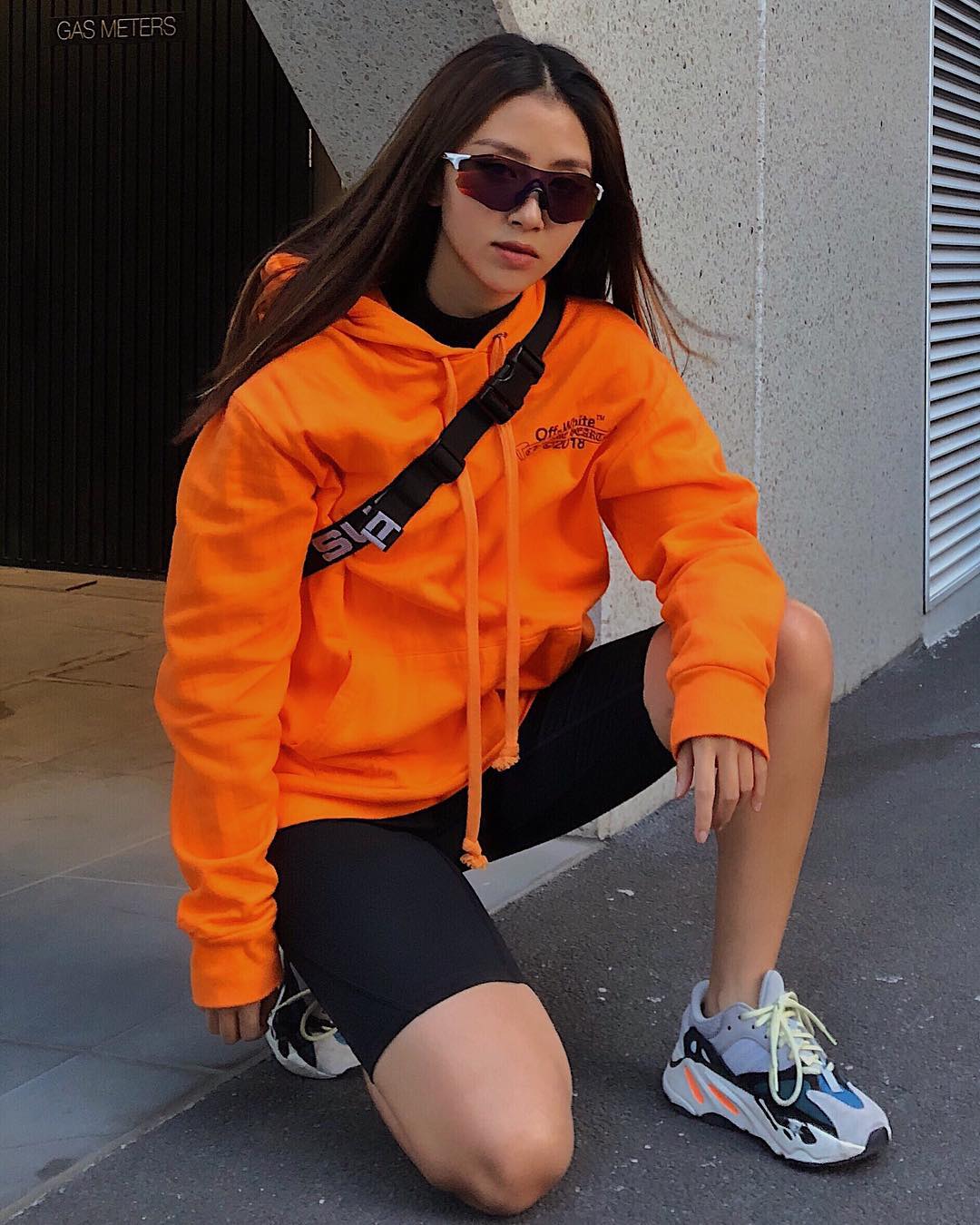 Quỳnh Anh Shyn nổi bần bật trên phố với set đồ đậm chất sporty khi mặc áo hoodie rộng màu cam tươi, quần đua xe khoe bắp vế.