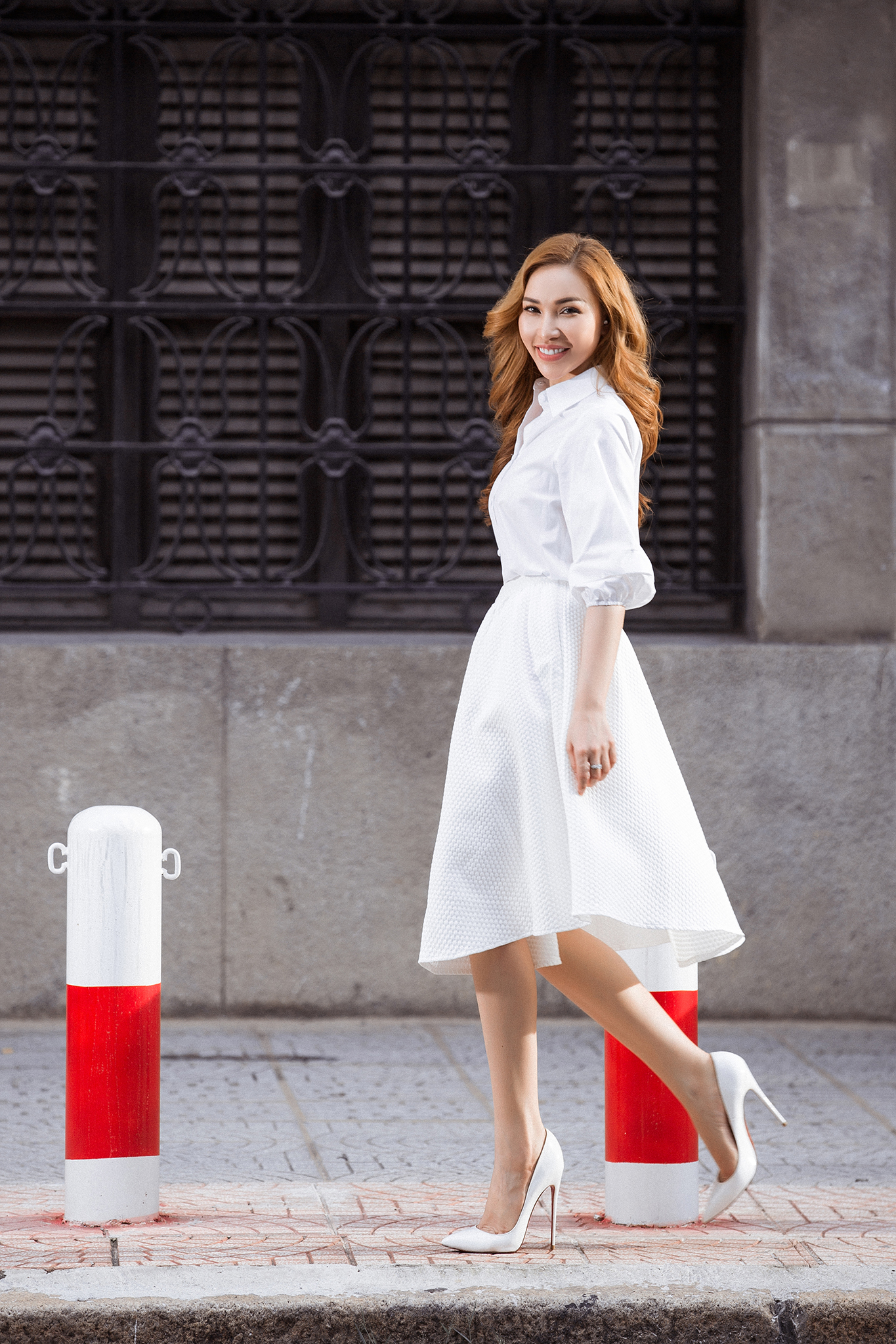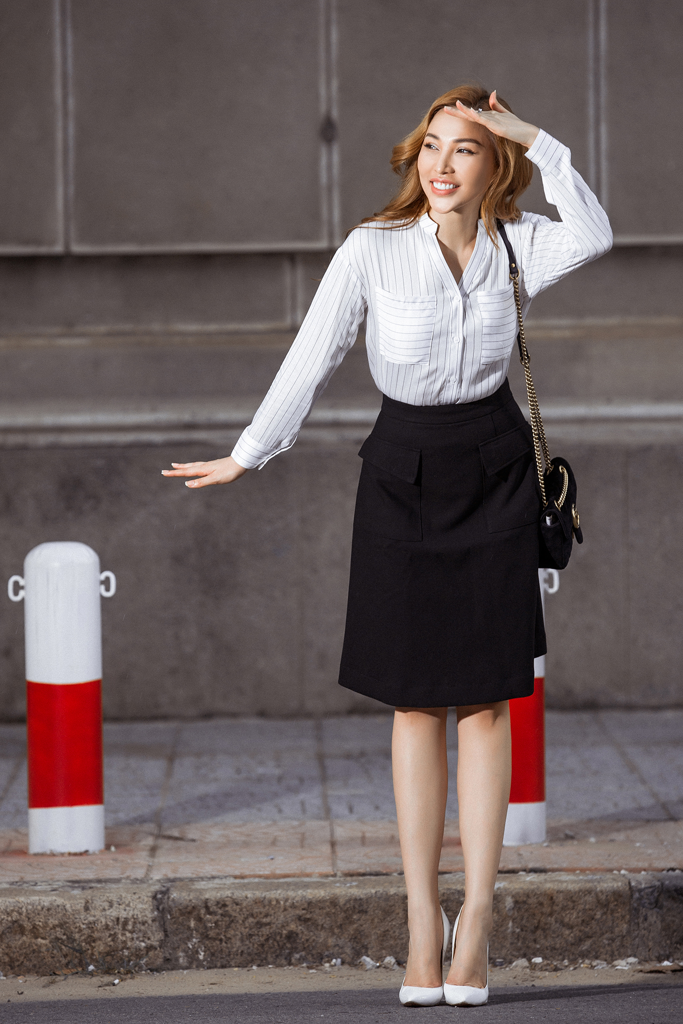 Ngoài những chiếc váy dáng suông nhẹ, nữ diễn viên Quỳnh Thư còn “bỏ túi” cho mình những chiếc áo sơ-mi kết hợp với chân váy trong màu sắc nhẹ nhàng. Đây là phong cách khá phổ biến khiến các cô nàng công sở khó lòng bỏ qua set đồ này.