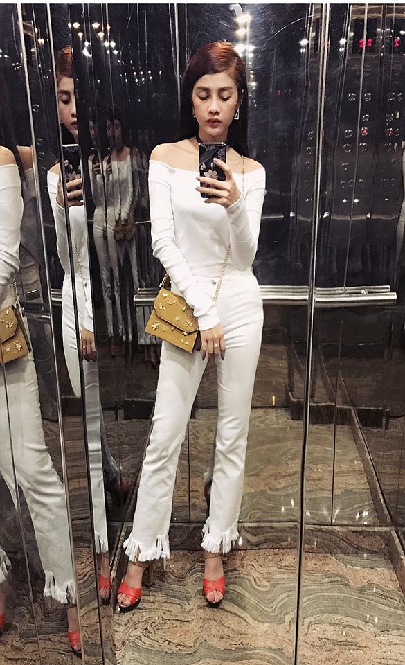 Trong một diễn biến khác, Mỹ Duyên chọn những items gam màu trắng tươi mới. Chiếc túi đeo chéo sắc vàng đồng sẽ là điểm nhấn đắt giá cho set đồ hoàn chỉnh hơn.