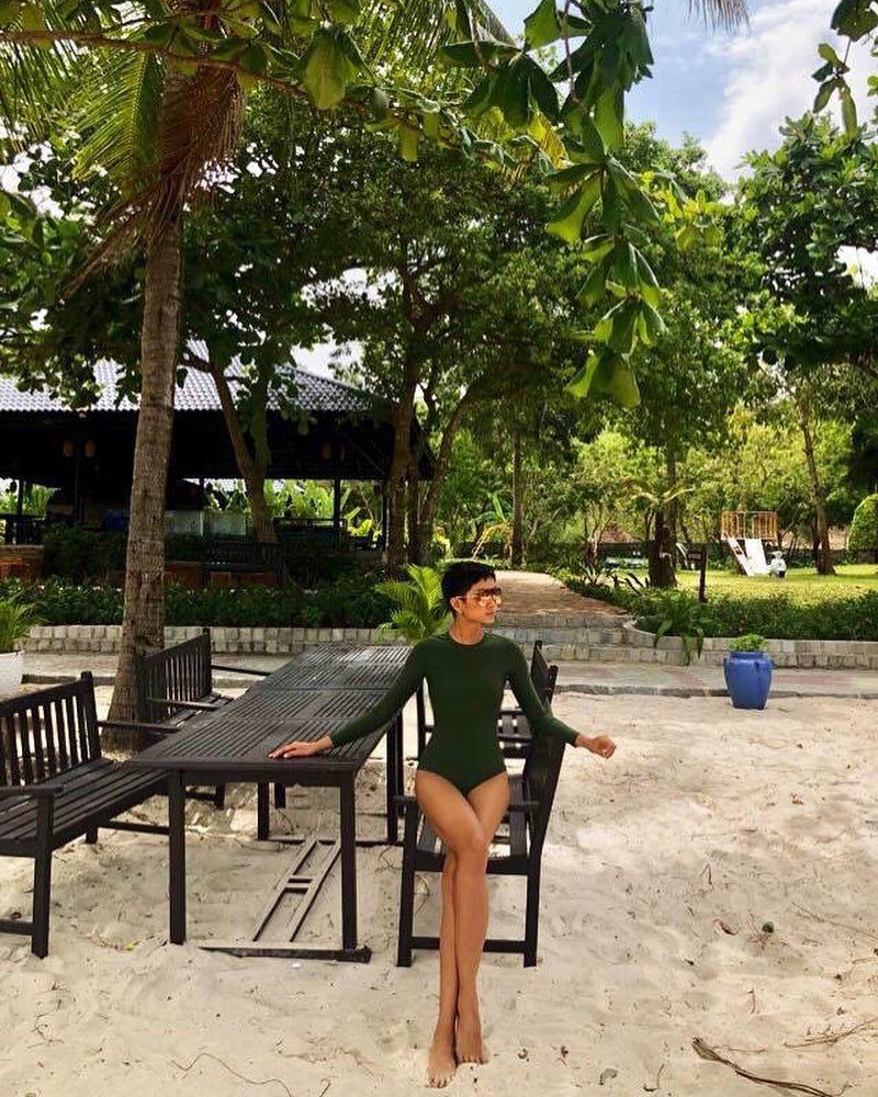 H'hen Niê khoe trọn vóc dáng gợi cảm với bộ bikini một mảnh. Tuy kín như bưng (dài tay), cao cổ nhưng với việc sử dụng chất liệu ôm sát, trang phục vẫn đủ sức giúp tôn lên vẻ sexy, quyến rũ của người mặc.