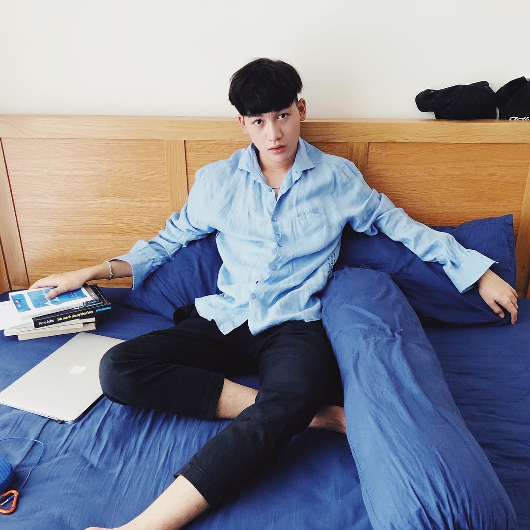 Áo sơ-mi pastel tông xanh dương đi cùng quần tây đen là combo trang phục tuy đơn giản, nhưng lại giúp tôn lên nét điển trai của Ali Hoàng Dương.