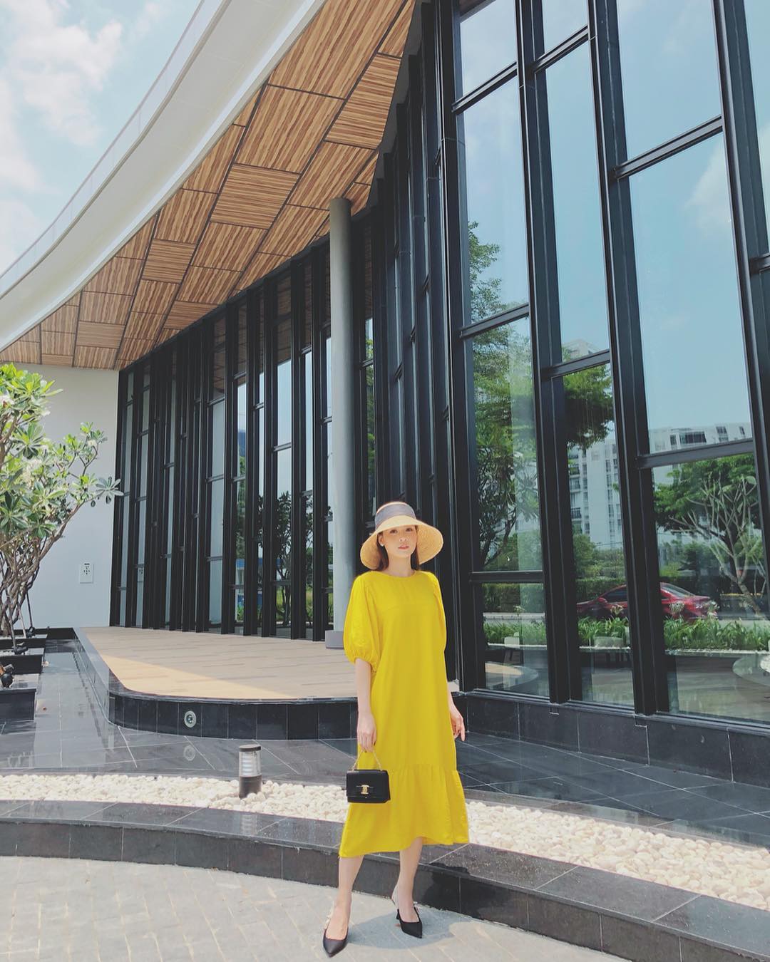 Có vẻ càng dần đến hè, các sao càng mê mẩn gam màu vàng như nắng. Sam lựa chọn váy suông tông vàng, mix cùng mũ cói đem đến cho cô nàng nét nhẹ nhàng, trong trẻo.