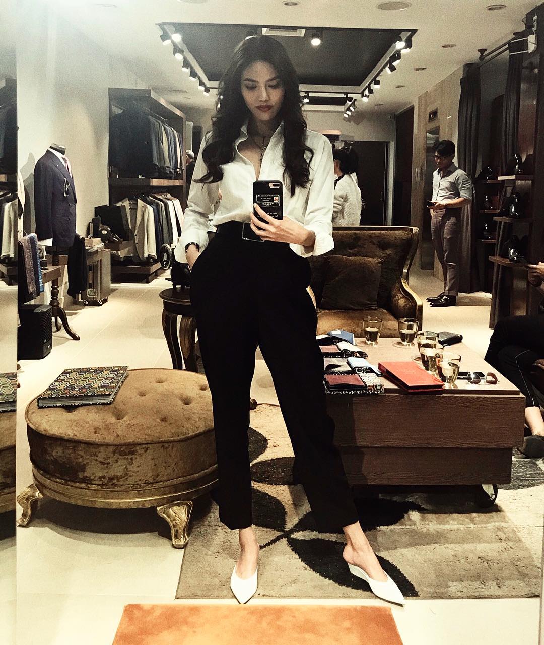 Chẳng cần cầu kỳ váy áo, Lan Khuê chỉ mặc áo sơ-mi mở vài nút ở cổ, đi cùng quần tây là đã đủ đẹp hết phần thiên hạ.
