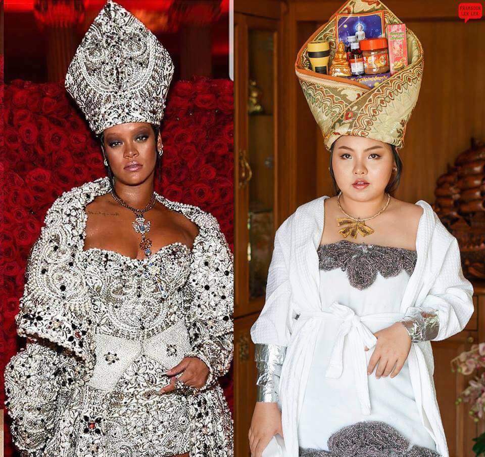 Áo choàng tắm buộc quanh mình, đầu đội chiếc khăn quấn khéo léo cùng cả đống chai, lọ, trông cô nàng có khác gì Rihanna đang đi dự Met Gala đâu.