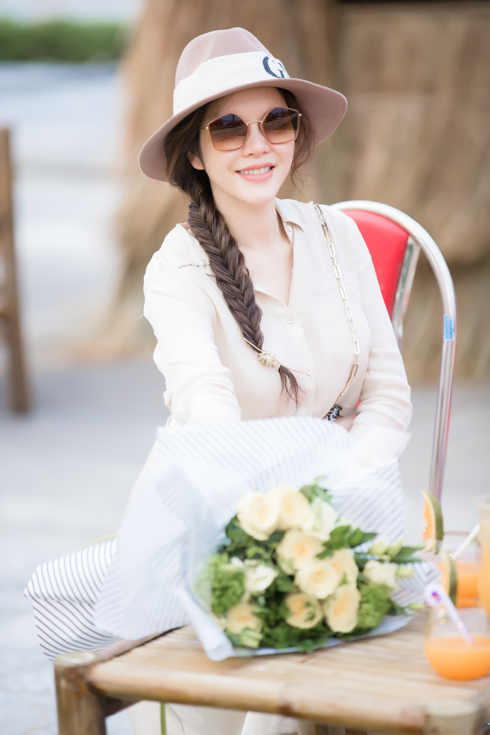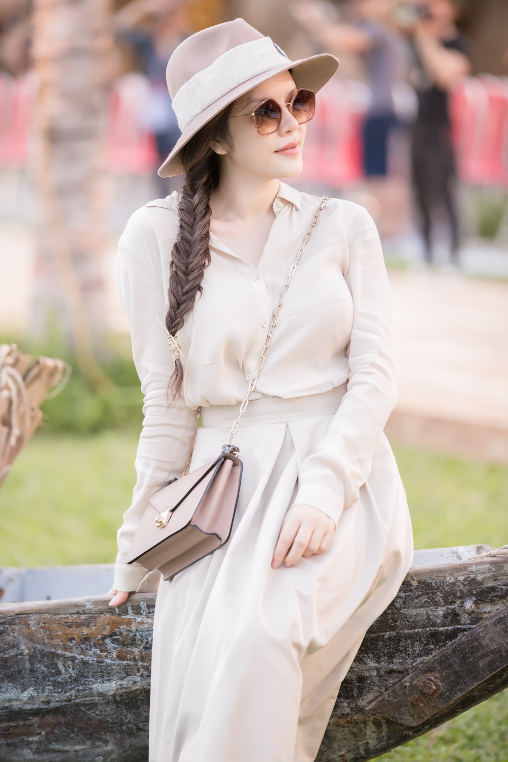 Dù thời tiết miền Trung khá nắng nóng, nhưng nữ doang nhân vẫn tươi trẻ cười thoải mái, tạo dáng trước ống kính.