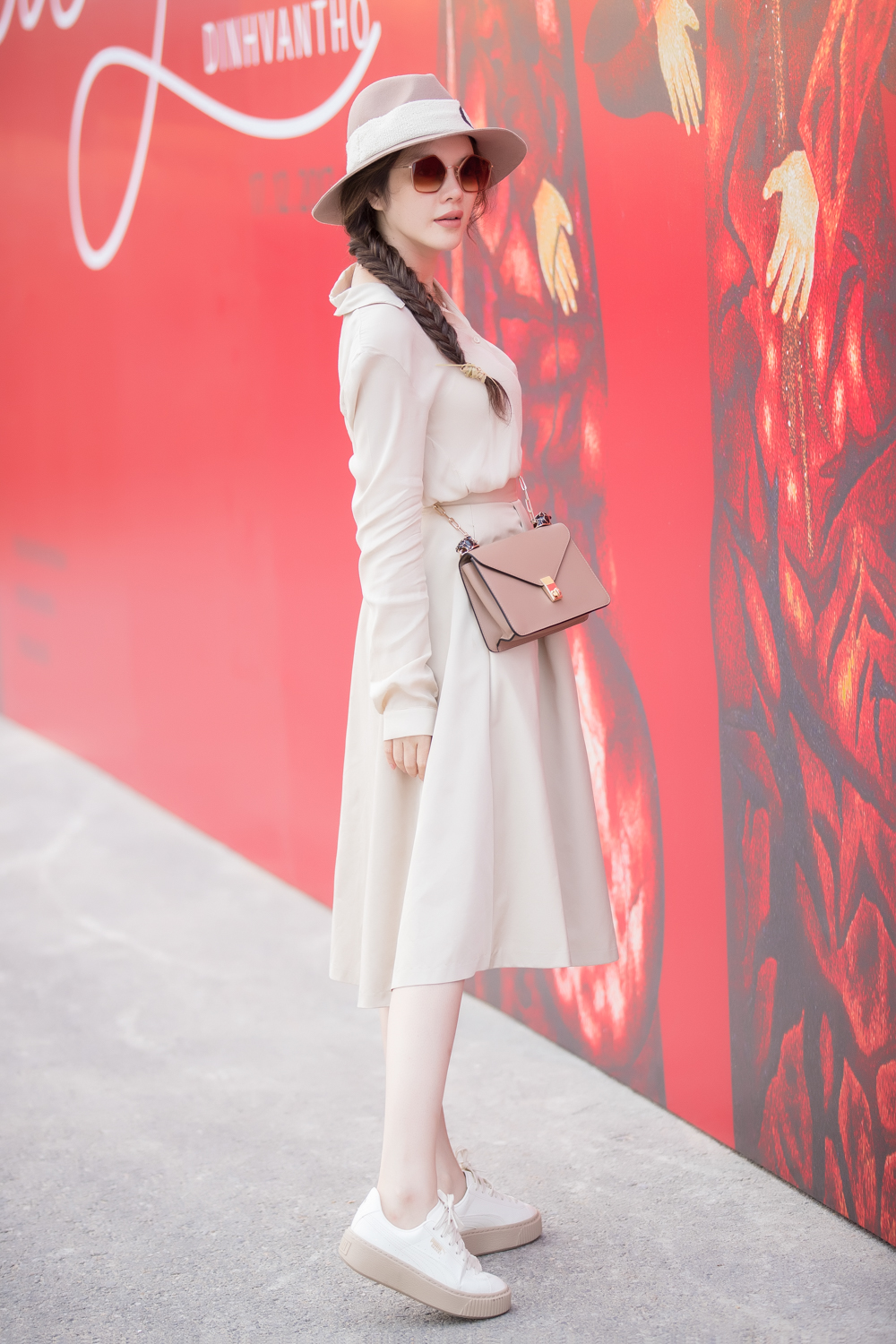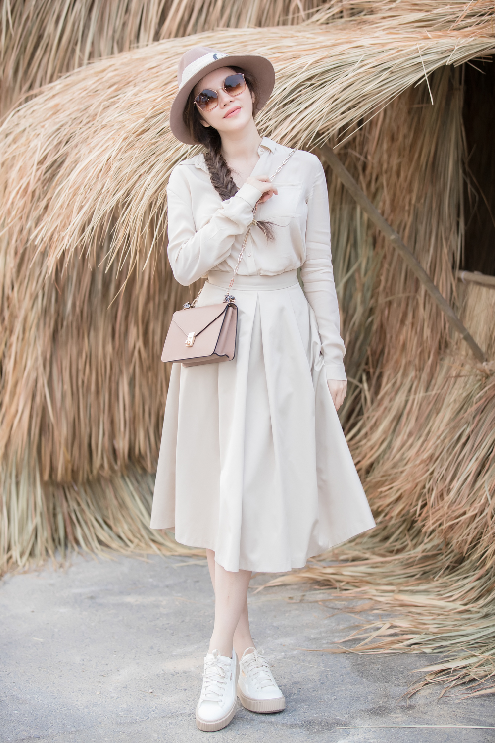 Chọn trang phục tông nude với giày và nón phối ton sur ton, đi giày đế bệt, Lý Nhã Kỳ trông năng động và trẻ trung so với tuổi.