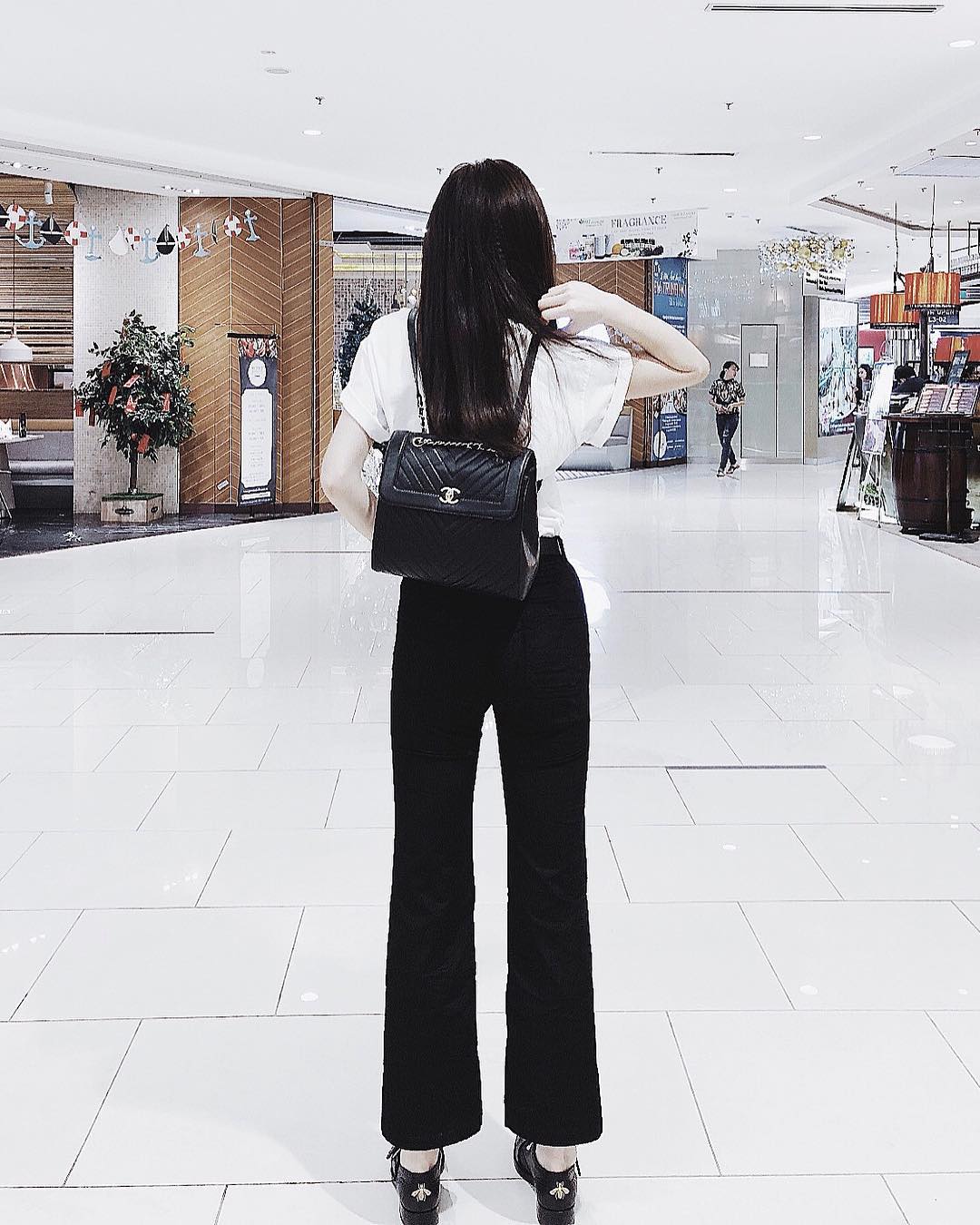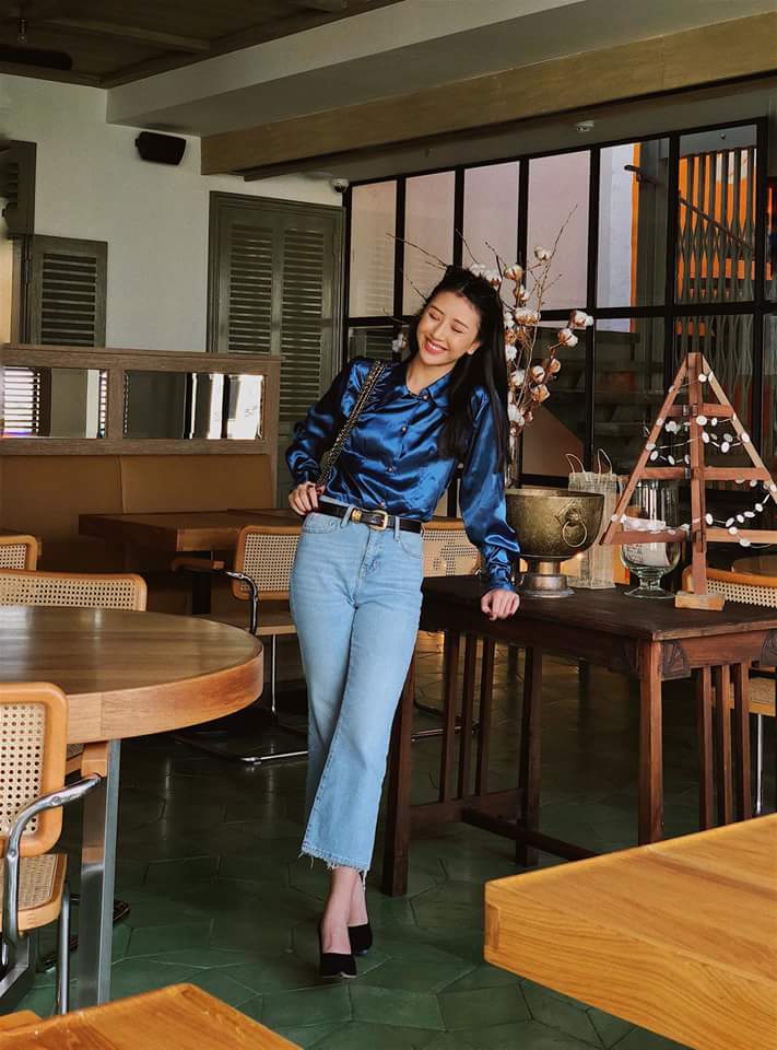 Được đánh giá cao vì phong cách ăn mặc, Quỳnh Anh Shyn không khiến người hâm mộ thất vọng khi lựa chọn bộ cánh gồm áo sơmi lụa cùng quần jeans ống loe. Cách chuyển tông màu xanh dương đậm nhạt từ áo xuống quần cũng mang lại cảm giác tăng chiều cao cho cô nàng hotgirl.