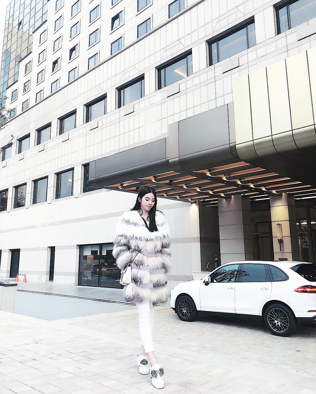 Jolie Nguyễn lại mang đến chút không khí se lạnh cuối năm khi trưng diện áo khoác lông gam màu đen trắng đối lập. Để cân bằng với phần trên nhiều chi tiết, người đẹp sinh năm 1997 lựa chọn quần ôm trắng cùng đôi giày loafer có chi tiết nơ lấp lánh.