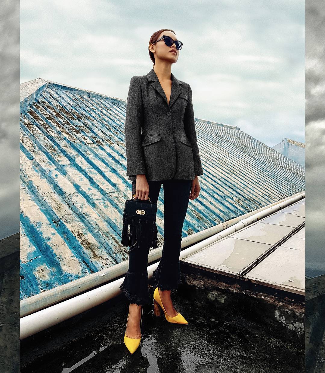 Trưng diện cả bộ suits màu đen, Mai Ngô tạo được điểm nhấn nhờ cách kết hợp phụ kiện cao gót màu vàng nổi bật. Ngoài ra, các phụ kiện khác như kính mát bản to cùng túi cầm tay cũng được đánh giá là phù hợp với tổng thể trang phục, tạo nên cái nhìn thanh lịch và thời thượng.