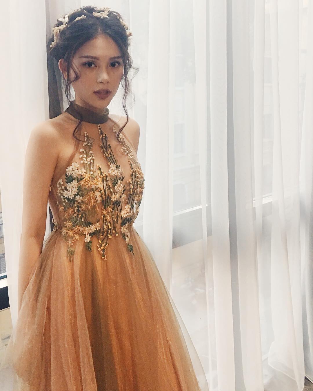 Mẫu yếm cách điệu cùng phần váy xòe màu nude. Linh Rin khoe trọn đôi vai trần thon thả, quyến rũ.
