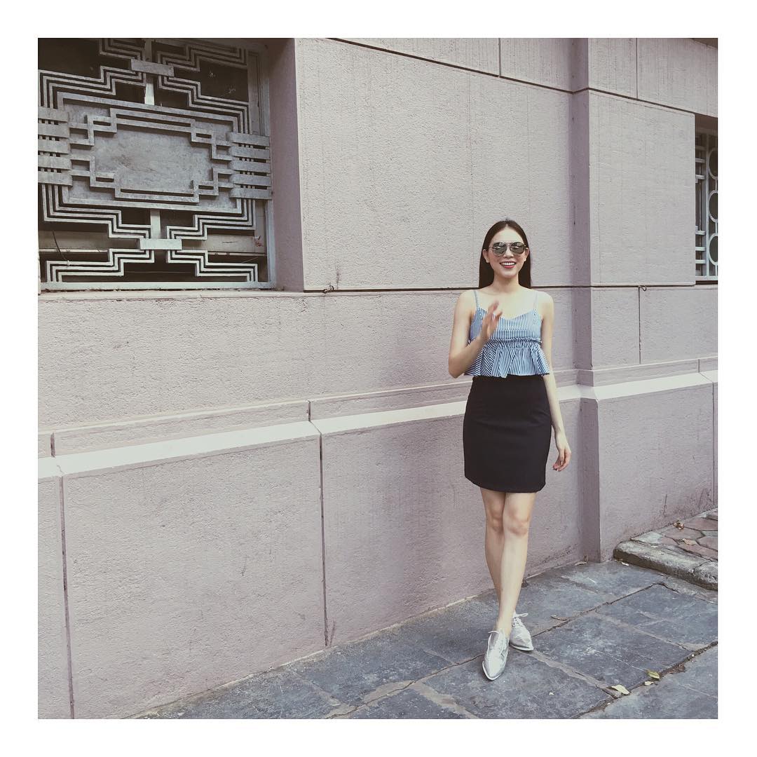 Xu hướng kẻ sọc chưa bao giờ lỗi mốt, nắm bắt được điều này, nàng mẫu 9X gốc Hà Thành lựa chọn cho mình mẫu áo đơn giản nhưng cũng không kém phần sành điệu.