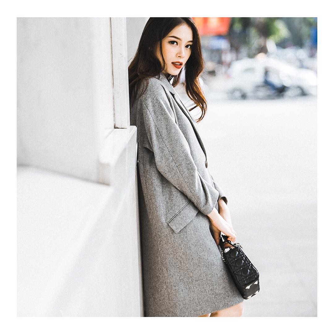 Mùa thu Hà Nội không thể thiếu những thiết kế coat dáng dài cho những lần xuống phố. Đi kèm với chiếc áo mang tông màu ghi trầm này là mẫu túi đến từ nhà mốt Dior.