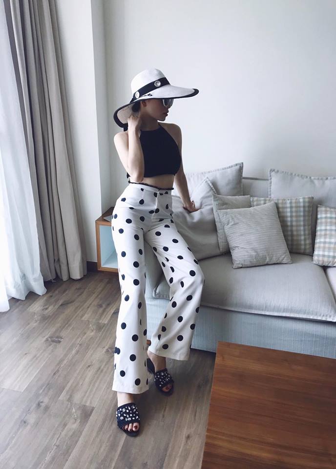 Họa tiết cổ điển chấm bi có vẻ không làm cho nàng hotgirl bị “nửa mùa” tí nào! Trái ngược lại, với kiểu dáng ống loe đang lên ngôi thì mẫu quần thuộc xu hướng vintage lại trông vô cùng hút mắt.