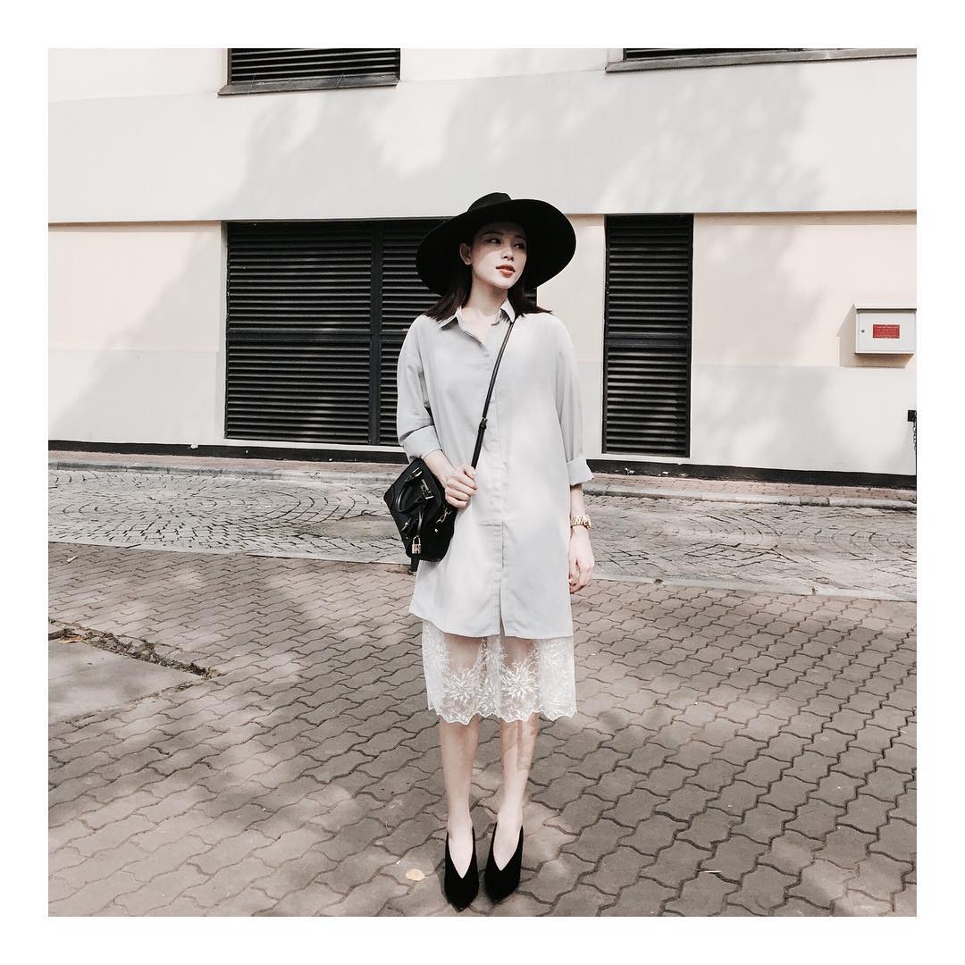 Ở một diễn biến khác, cô nàng lại thể hiện sự phối đồ tài tình khi kết hợp các tông đen từ nón, túi đến giày cao gót để làm bật được mẫu đầm sơmi trắng.
