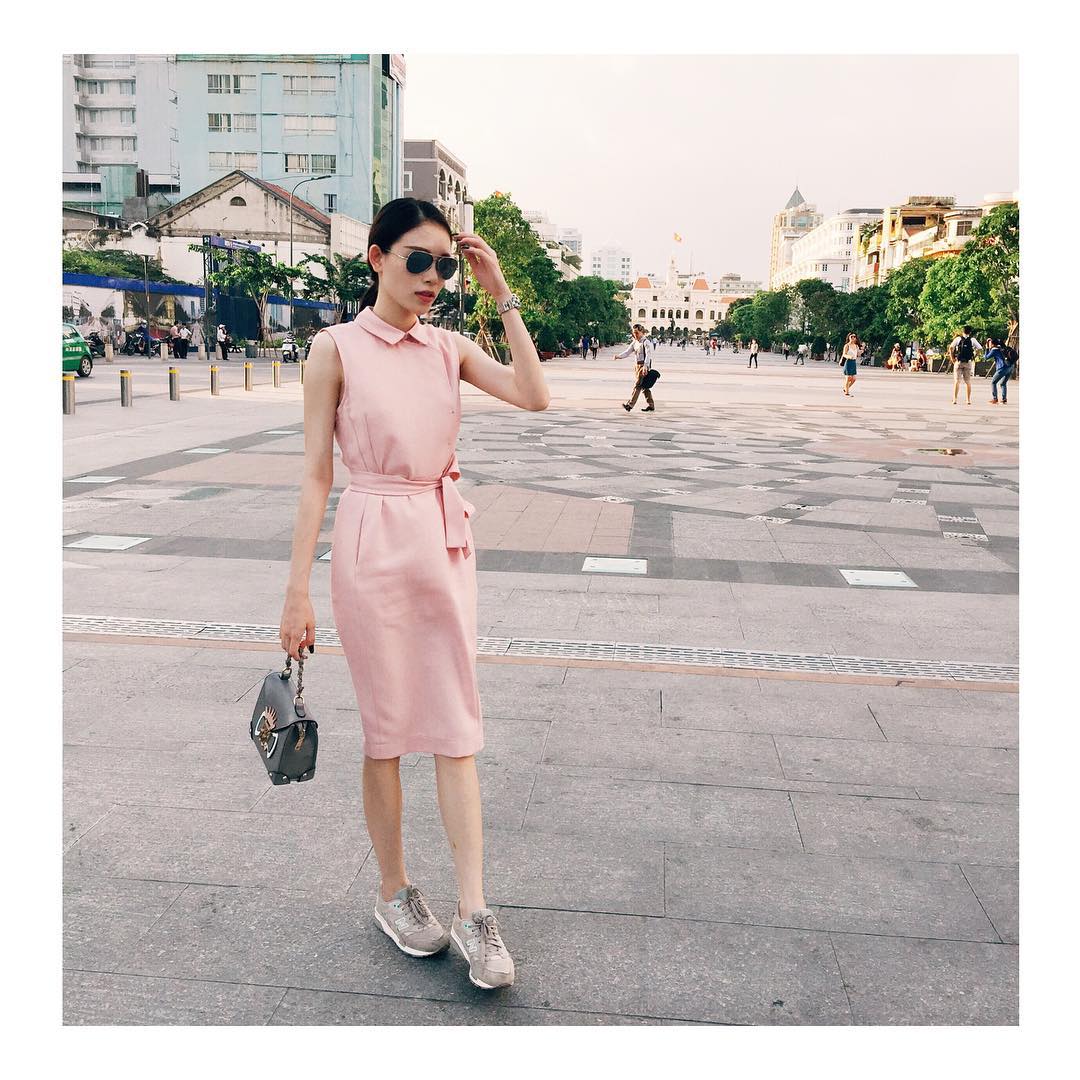 Mẫu đầm với phần dây thắt ngang hông như một điểm nhấn vừa khéo léo khoe vòng eo con kiến lại vừa nổi bật giữa phố xá đông người. Đồng thời, Linh Rin còn kết hợp giữa phong cách nữ tính và khỏe khoắn, năng động bằng mẫu sneaker đầy tính thời trang.