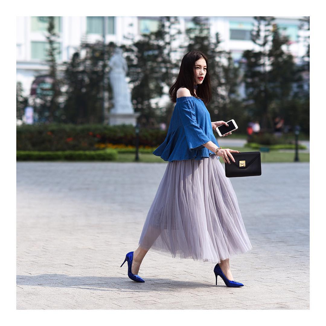 Là hotgirl đình đám ghi điểm với gout thời trang biến hóa đa dạng, Linh Rin chẳng khác gì một fashionista chính hiệu. Linh hoạt trong cách chọn màu, hai sắc xanh - tím đậm nhạt khác nhau nhưng lại khéo léo hòa quyện trong cùng một set đồ khiến cả tổng thể nổi bần bật.