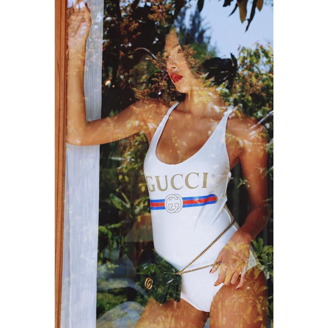 Siêu mẫu có vẻ yêu thích mẫu áo tắm này đến nàng, cô tậu hẳn hai chiếc giống nhau hoàn toàn về thiết kế, chỉ khác đôi chút về màu sắc.