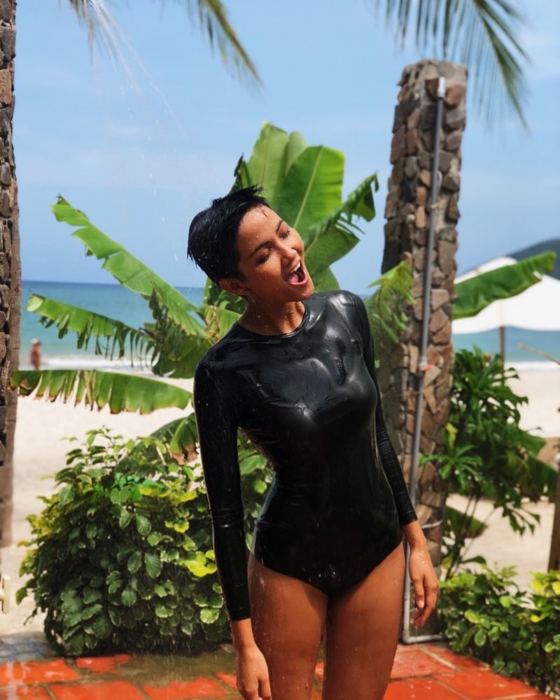 H'hen Niê cũng mặc thiết kế áo tắm có phần tay dài giống Tóc Tiên, nhưng chi tiết cổ cao khiến người đẹp trông có phần kín đáo hơn.