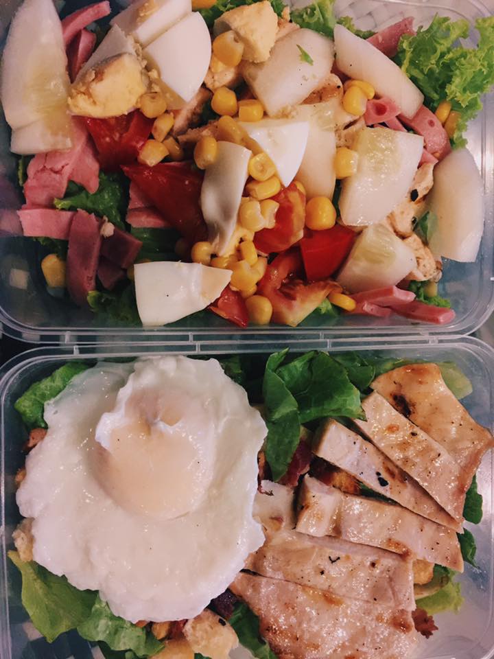 Bữa tối mà theo Châu Bùi là khiến cô nàng vừa ăn vừa khóc mà không dám bỏ miếng nào vì sợ phí công tập luyện. Salad gồm trứng gà luộc, rau xà lách, ngô ngọt, jambong, cà chua…