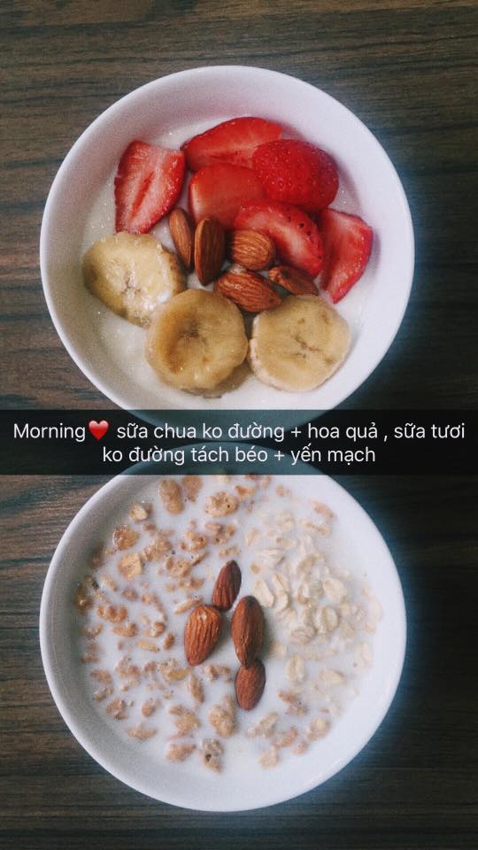 Châu Bùi là cô nàng cực kì chăm chỉ vào phòng tập gym. Trừ khi có lịch đi xa hay quay phim thì phải nghỉ chứ không thì ngày nào cũng thấy cô gái này “điểm danh” ở phòng tập. Không chỉ là các bài tập luyện cho thân hình săn chắc mà đi kèm với đó là cả một thực đơn những món ăn bổ sung năng lượng. Châu Bùi còn cẩn thận chụp lại từng món và chia sẻ bí quyết nữa cơ. Nghe đến đây thì đừng tưởng là được sung sướng ăn ngon nhé, không hề đâu, nhìn list đồ ăn dưới đây sẽ rõ: