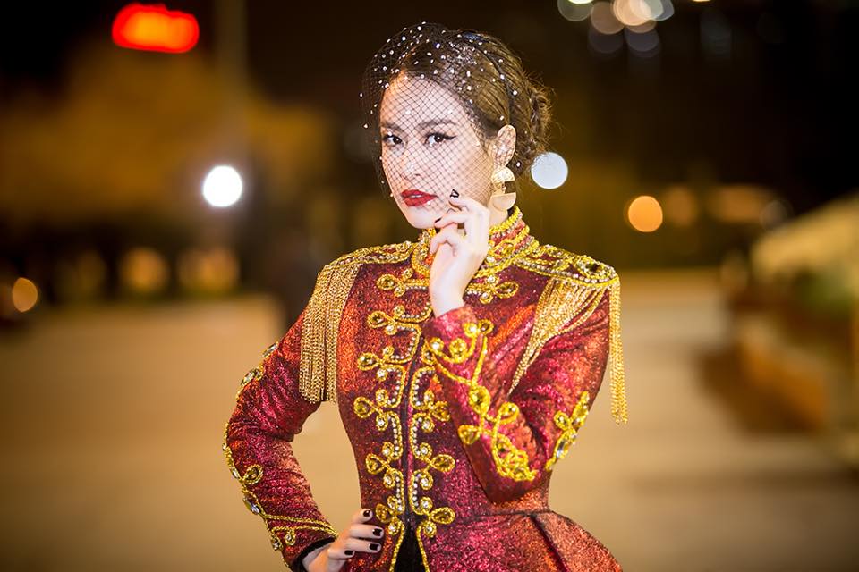 Stylist Hoàng Ku như thường lệ vẫn là “người đàn ông” đứng sau sự tỏa sáng lấp lánh của cô nàng. Chiếc áo choàng dài kiểu hoàng gia đi kèm với phụ kiện là mạng lưới che mặt mang tới cho Hoàng Thùy Linh nét đẹp sang trọng mà vẫn quyến rũ.