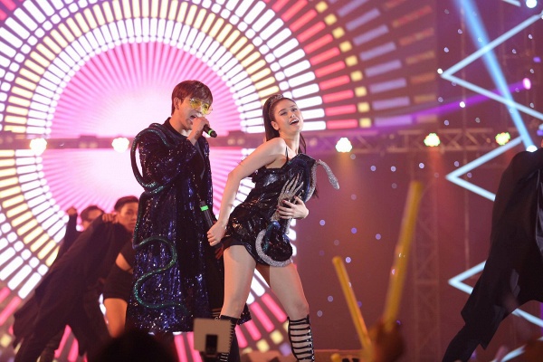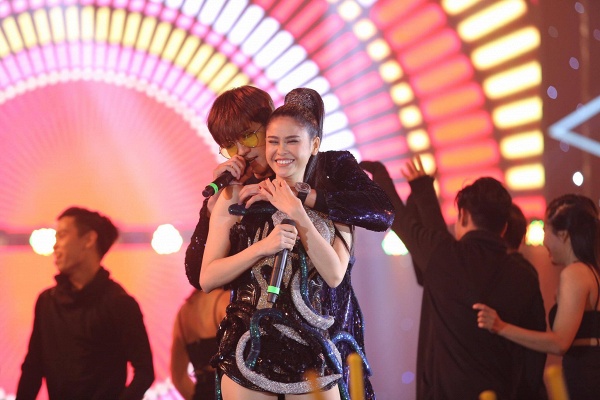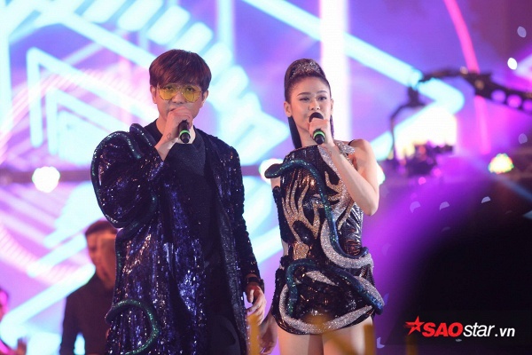 Tim và Trương Quỳnh Anh cũng có màn song ca tại một show ca nhạc. Cả 2 diện những thiết kế với họa tiết rắn 3D bắt mắt.