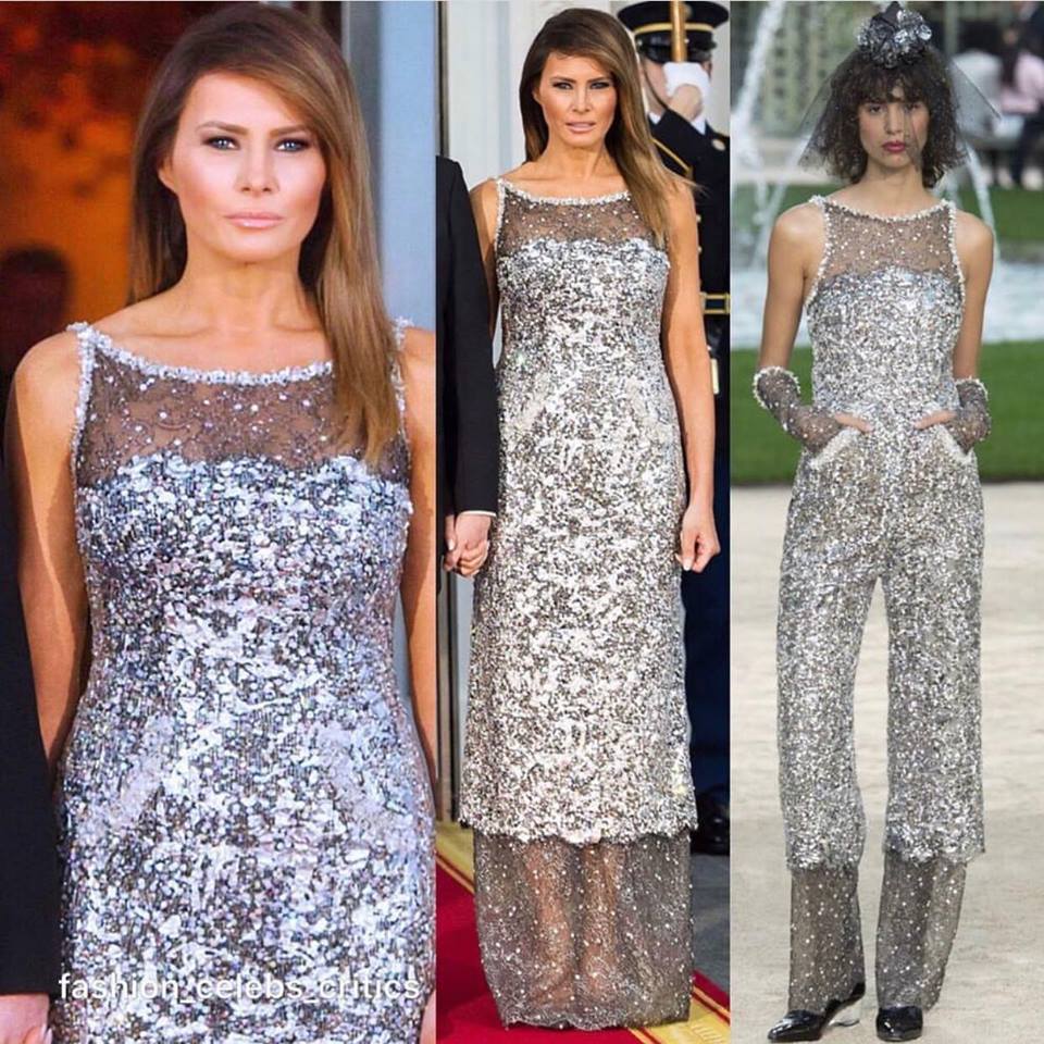 Thường được biết đến với hình tượng một đệ nhất phu nhân thanh lịch, cùng gu thẩm mỹ tuyệt vời được tích góp từ những năm tháng làm người mẫu trong quá khứ, song, mới đây, trong bữa tiệc thân mật đón tiếp tổng thống Pháp cùng phu nhân đến thăm nhà Trắng, phu nhân của tổng thống Mỹ - Melania Trump đã khiến các tín đồ thời trang ngạc nhiên khi diện một thiết kế đầm dài đính sequin, phô bày hết mọi khuyết điểm vóc dáng.