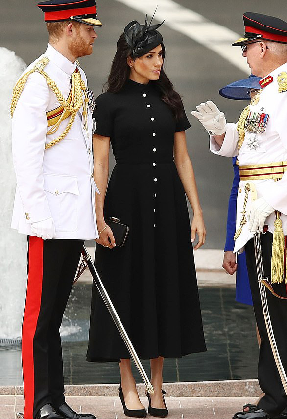 Buổi tối cùng ngày, cô diện 1 chiếc đầm đen cộc tay cổ vuông vô cùng thanh lịch để tham dự tiệc tối. Chiếc váy có giá 2.000 bảng Anh (khoảng 61 triệu đồng) là sản phẩm của nhà thiết kế Emilia Wickstead - người đã đưa ra những nhận xét không hay về váy cưới của Markle.