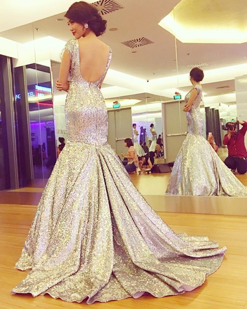 Lan Khuê khoe nét duyên trong thiết kế của Lý Quí Khánh với tông màu ánh bạc lấp lánh, tạo hiệu ứng dưới ánh đèn sân khấu.