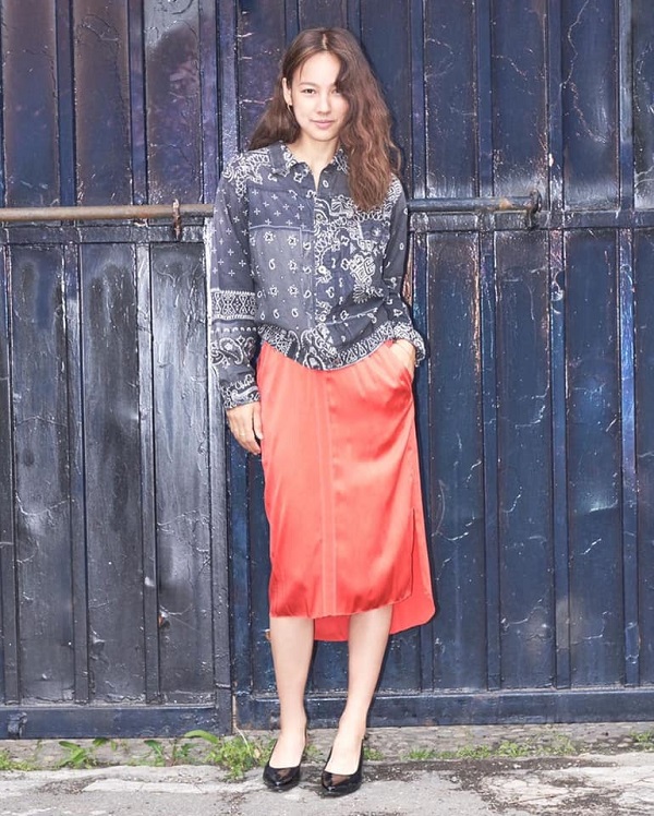 Quý cô vintage với áo sơ mi họa tiết xanh biển sẫm mix cùng váy đỏ khó nhằn thế mà qua tay Lee Hyori thì vẫn đẹp và “chất” theo kiểu riêng