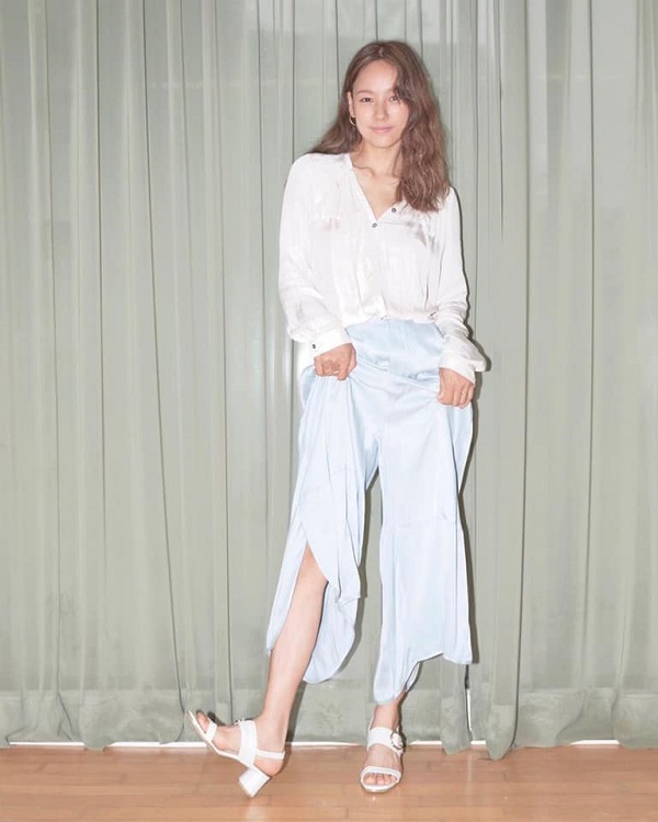 “Nữ hoàng gợi cảm Kpop” nữ tính và đáng yêu trong set đồ pastel với chất liệu vải silk mát mẻ rất hợp với khí hậu mùa hè. Áo sơ mi mỏng nhẹ trắng tinh khôi mix cùng quần dài silk màu xanh pastel ngọt ngào