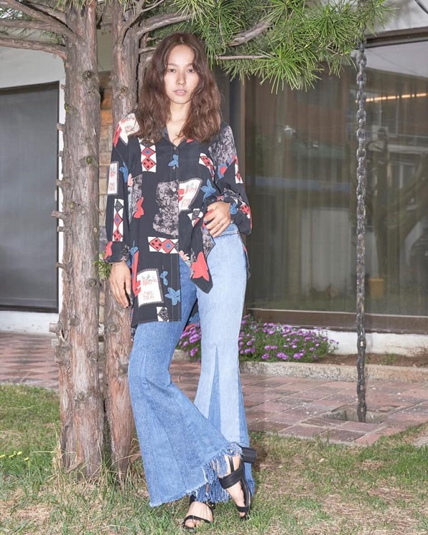 Diva Kpop Hyori “chất lừ” với trang phục đậm retro với áo sơ mi họa tiết oversized phối cùng quần jeans ống rộng đi cùng giày sandals đế thấp