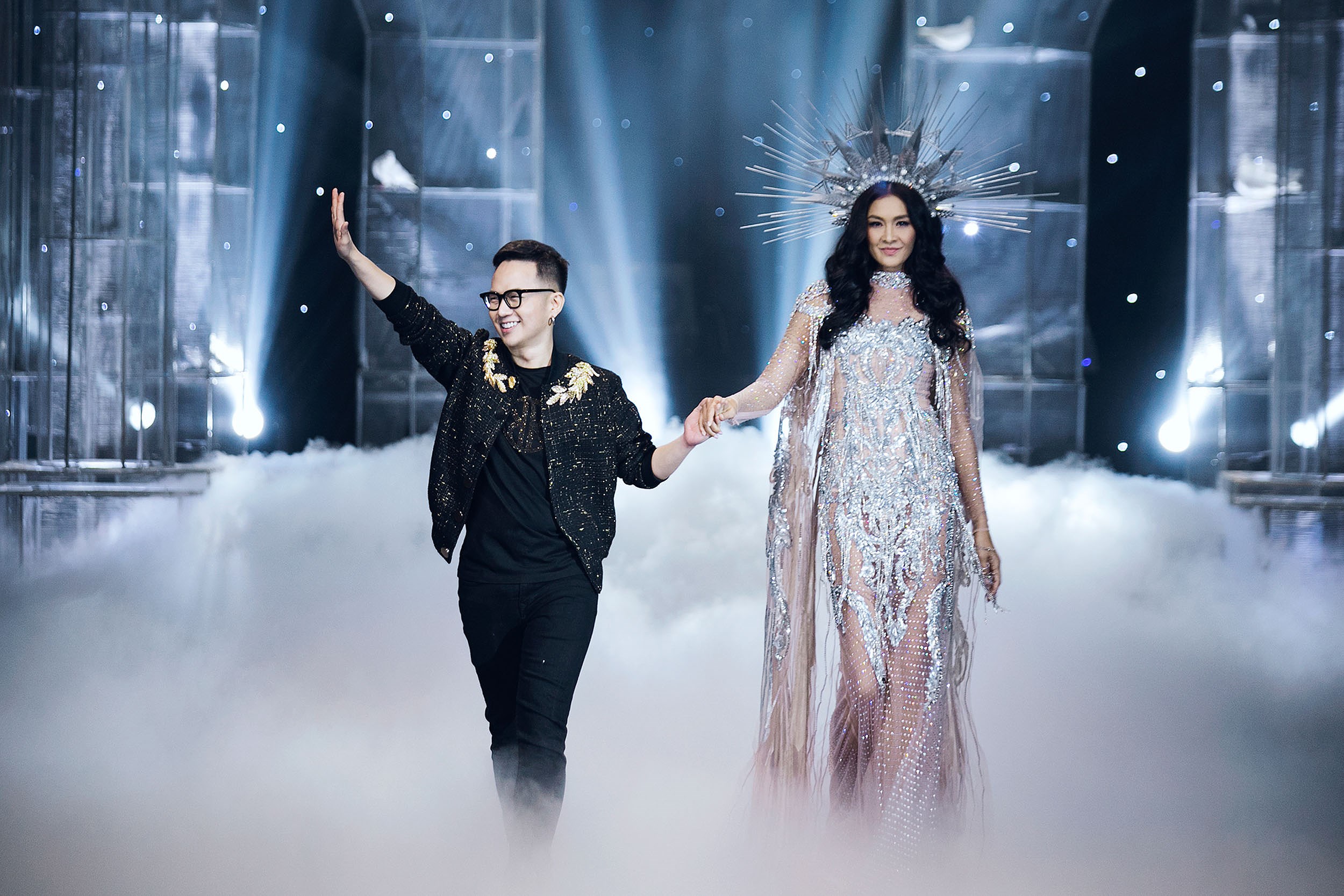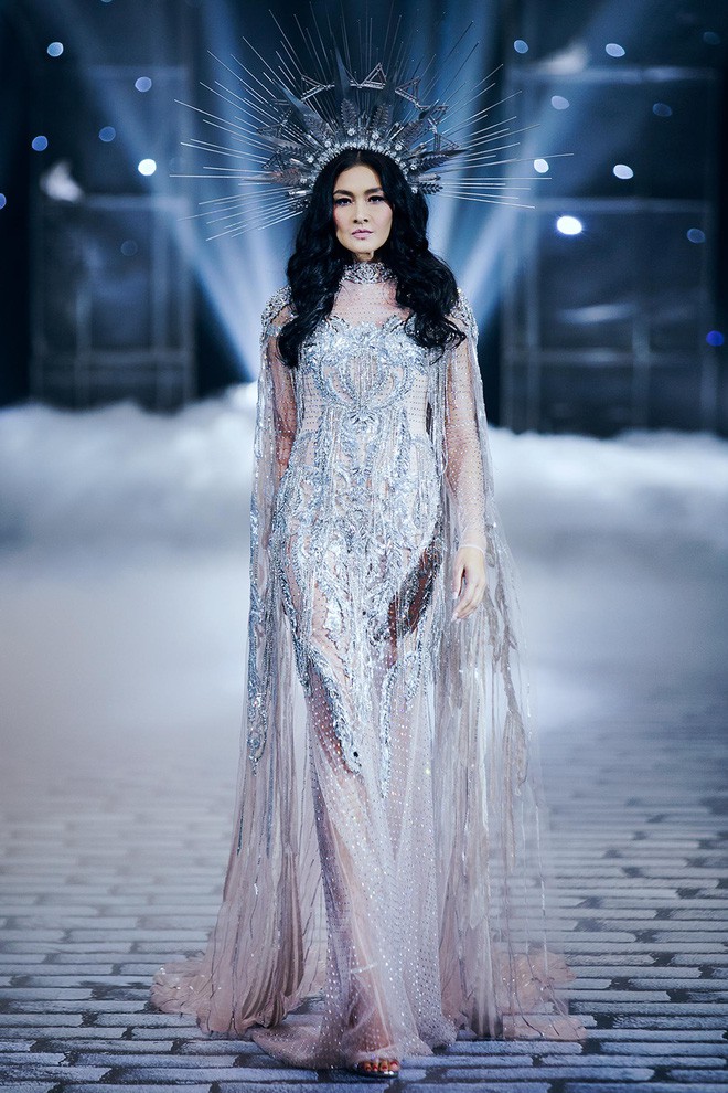 Diện đầm đuôi cá ôm sát khoe trọn vóc dáng, đầu đội chiếc mão được thiết kế công phu, nữ diễn viên, siêu mẫu sinh năm 1972 như một vị thần mặt trời uy nghi đầy quyền lực. Sau lần hợp tác này, giữa nhà mốt Việt với chân dài xứ Chùa vàng khá hợp nhau. Đó là lý do có sự hợp tác trở lại giữa hai người.