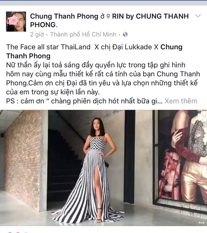 Đây không phải là lần đầu tiên HLV The Face Thái - Lukkade khoác lên người thiết kế của NTK Chung Thanh Phong. Trước khi quyết định lựa chọn thiết kế đầm xẻ cao này cho buổi ghi hình đầu tiên của The Face, “chị đại” Lukkade đã từng nhận lời mời sang Việt Nam tham dự và trình diễn trong show diễn của Chung Thanh Phong với BST “She’s A Goddess” - Xuân/Hè 2018.
