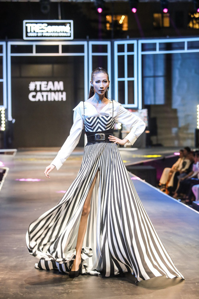 Đây chính là thiết kế của NTK Chung Thanh Phong được “chị đại” Lukkade diện ngay trong buổi ghi hình The Face Thái 2018. Bộ đầm xẻ cao giúp người đẹp khoe trọn đôi chân dài, những đường kẻ sọc đánh thức thị giác người nhìn, tôn được sắc vóc quyền lực, cao sang của siêu mẫu.