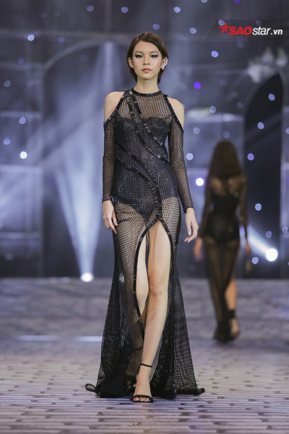 Thùy Dung - thí sinh The Look năm nay cũng chứng tỏ khả năng làm chủ sàn diễn của mình. Cô diện bộ váy với phần cúp ngực cảm, chất liệu gấm dập pli tạo nên cảm giác bồng bềnh, quyến rũ.