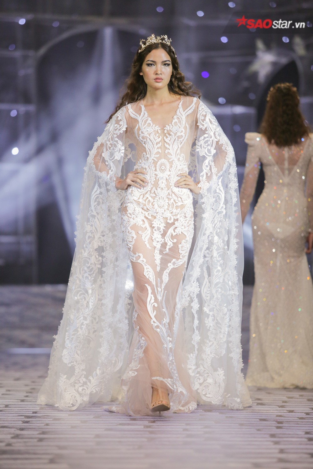 Chất liệu ren cùng kỹ thuật đính kết pha lê tinh xảo được sử dụng trong hầu hết các mẫu thiết kế.